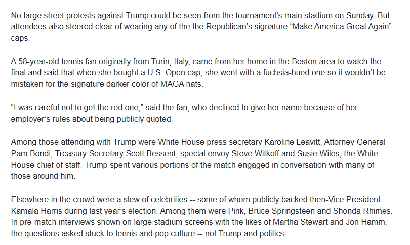 Among those in attendance were numerous celebrities, some of whom publicly endorsed then-Vice President Kamala Harris in last year’s election. They included Pink, Bruce Springsteen, and Shonda Rhimes. During pre-match interviews with stars like Martha Stewart and Jon Hamm, broadcast on a giant screen in the stadium, questions focused on tennis and pop culture, not Trump and politics.